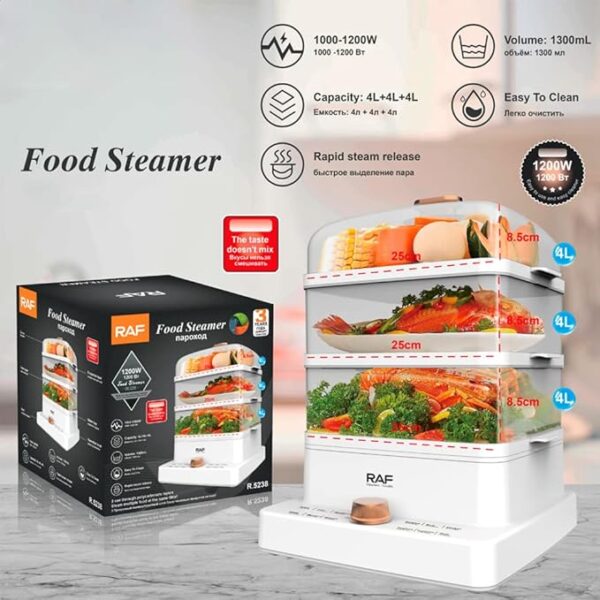 Embrace healthy and flavorful cooking with the RAF Food Steamer, a high-performance kitchen appliance designed for nutritious and efficient meal preparation. With 1200W of power and three stackable 4L tiers, this steamer lets you cook vegetables, seafood, meat, and grains simultaneously without mixing flavors. The transparent polycarbonate layers allow you to monitor progress, while the large 1300ml water tank ensures uninterrupted steaming. Easy to clean and dishwasher-safe, it’s perfect for health-conscious households seeking to preserve vitamins and natural taste in every dish.