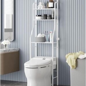 Toilet storage rack, bathroom organizer, adjustable shelves, wall-mounted rack, floor-mounted shelf, bathroom decor, space-saving rack, plastic bathroom storage, trapezoidal shelf, smooth finish storage.