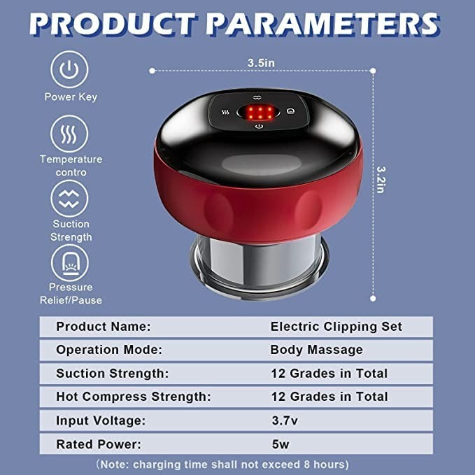 • Functional Mode: Offering suction of 12 different modes and 12 intensity levels, Effectively promoting blood circulation, dredging the meridians, stimulating acupoints, relieving fatigue, relieving pain, dispelling cold, and dehumidification.